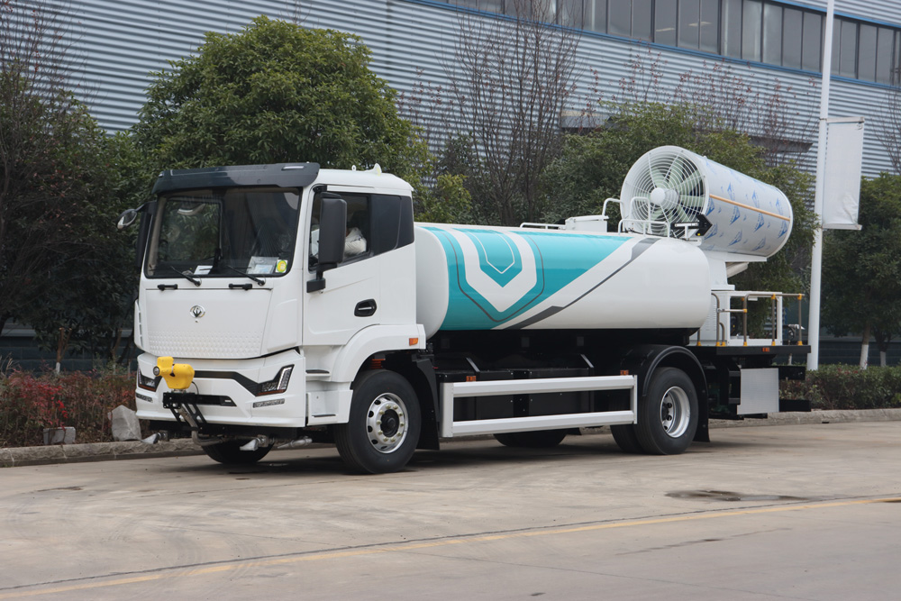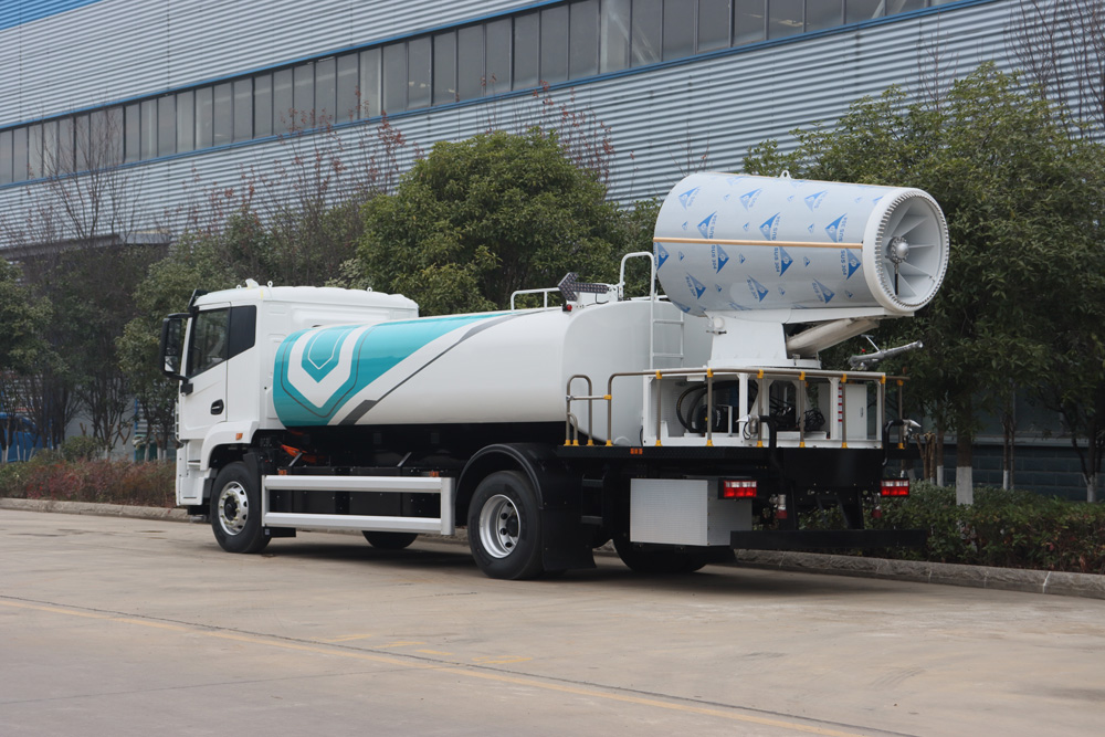 整車具備前噴、對沖、后灑、側噴、綠化水炮、霧炮,外接手動噴槍等多種作業功能,均可單 獨或組合使用,罐體有效容積 9.65m³ , 同級別行業最大;