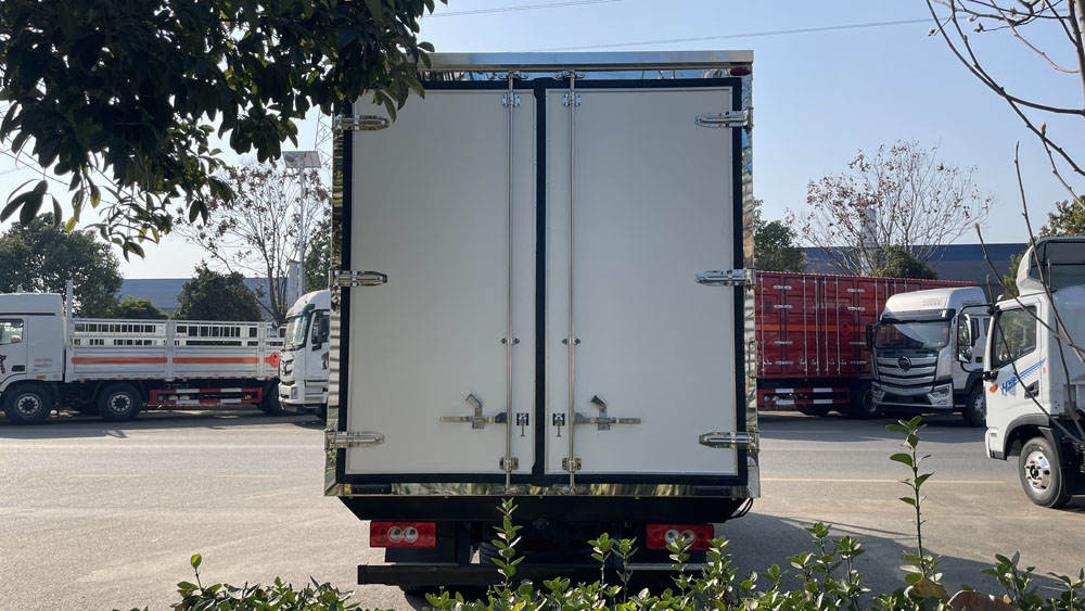 二、廂體配置:采用我司《晶龍工藝》專利技術——1200噸液壓加熱固化設備一體成型生產線制造,廂體保溫技術達到國家A級標準,廂體尺寸:080,3700×1960,2100×1800(mm)。工藝特點:1、廂板采用全密封樹脂膠粘連聚氨酯發泡板高壓加熱固化而成,厚度8cm;2、廂板內外面料為2.5mm厚新款納米玻璃鋼(不吸光,隔熱性好,硬度強,抗氧化);3、粘連輔料為玻璃纖維絲布;4、無空隙填充聚氨酯發泡保溫材料;5、全密封樹脂膠粘連;6、預埋實木加固廂體;7、防銹處理槽鋼框架支撐;8、鋁合金包邊、不銹鋼包角;9、內部加裝LED照明燈及廂體示寬燈;10、后門框、鉸鏈、鎖件均為不銹鋼材質;11、后門加裝防撞膠塊;12、采用三元乙丙橡膠密封條。