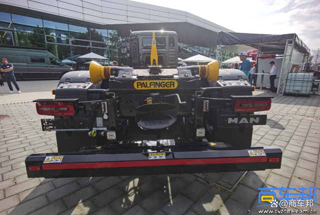 德國曼恩自裝卸式消防車采用德國曼恩TGS 26.470 6×2-4底盤 窄體平頂駕駛室,470馬力,驅(qū)動型式6×2-4,即第二橋驅(qū)動,第三橋為提升橋,可以反向轉(zhuǎn)向(有液壓缸驅(qū)動車輪轉(zhuǎn)向,不是隨動轉(zhuǎn)向),轉(zhuǎn)彎半徑更小。